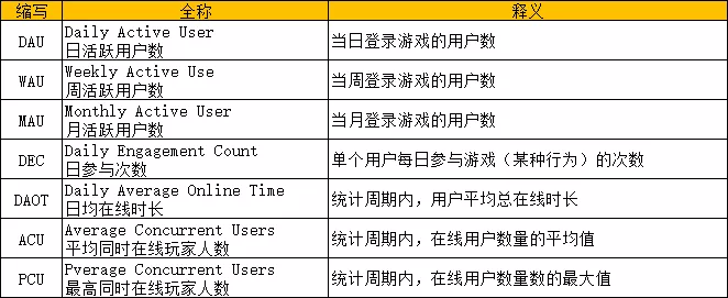 日活DAU应该是最常见,也是现在游戏最看重的指标之一。而观察用户粘性(活跃度)有好几种维度,用DAU/MAU可以得出更宏观的数据,月活用户里有多少是日活用户;也可以直接看DEC和DAOT这样的微观数据,一个玩家会在游戏中进行多少次的交互(做任务、PK、帮会战等),消耗了多少时间。当然,也有更为细化的,具体到某个玩法模块上的统计,这里就不再赘述了。