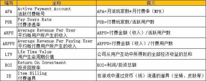 玩家留下来后,就是要算付费情况了。这里没有写MPR或者DPR,既月付费率和日付费率,因为其实一般情况下看总体的PUR付费渗透率就可以了,另外ARPU也是商业化运营比较关注的点。ARPPU在大多数情况下和ARPU其实是一个意思,不过是使用场景差异,另外 IB 可以理解成运营投放到游戏里需要充值才可以获得的道具资源。