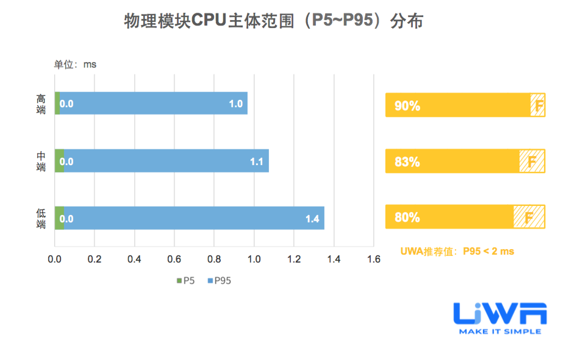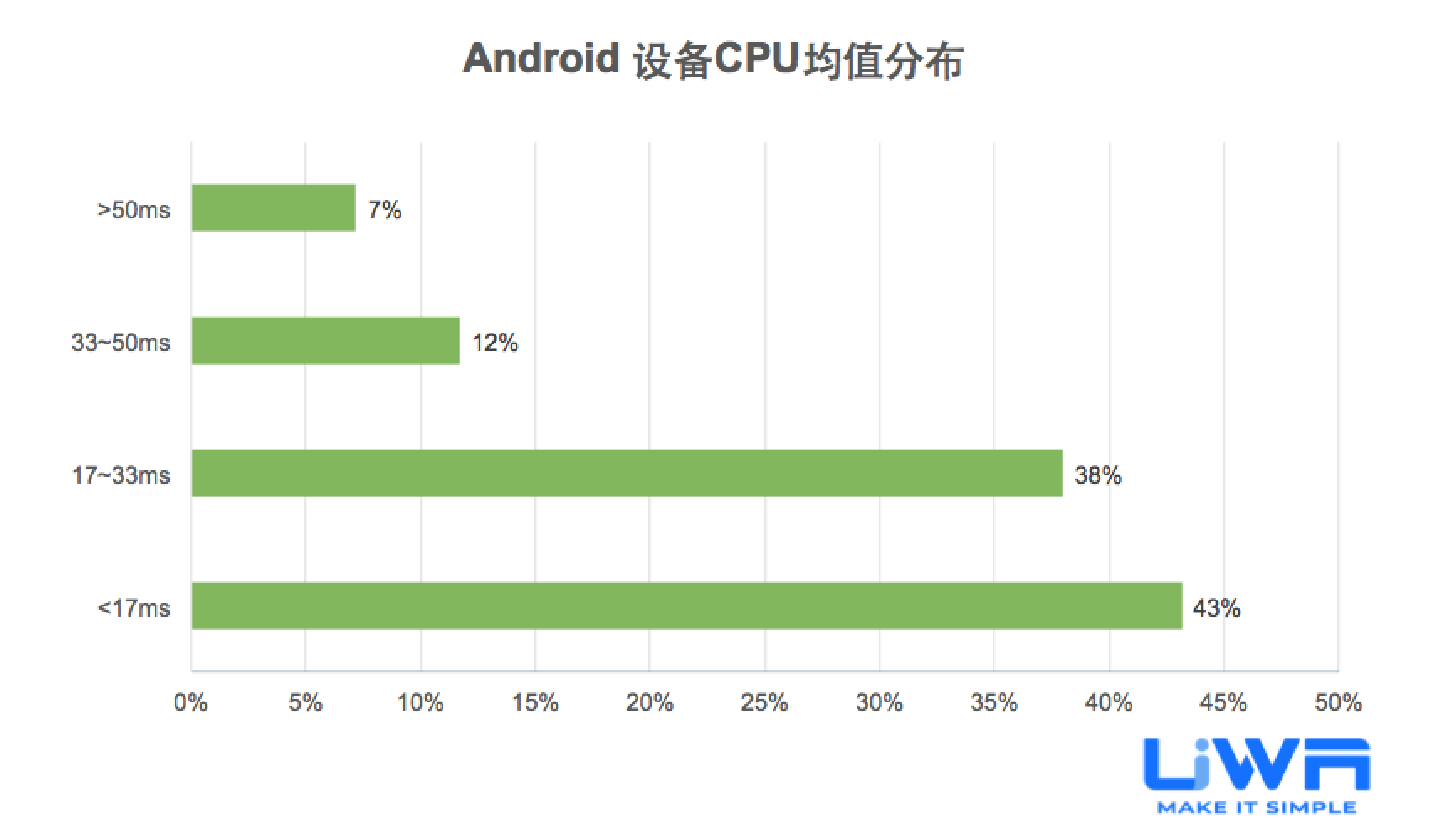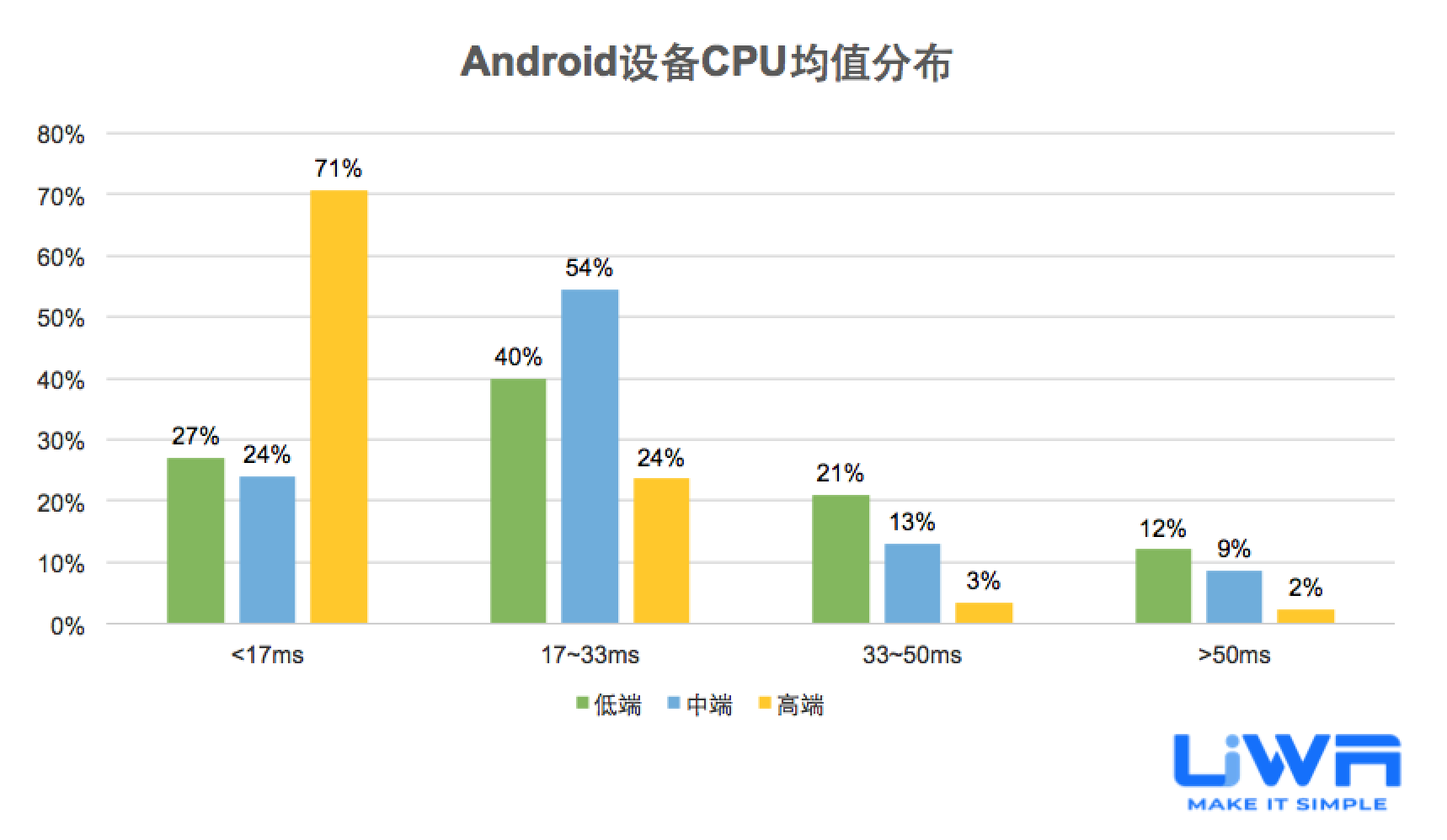 Android设备的CPU均值主体范围为7.956.2 ms,且主要集中在1733ms和< 17ms两档。