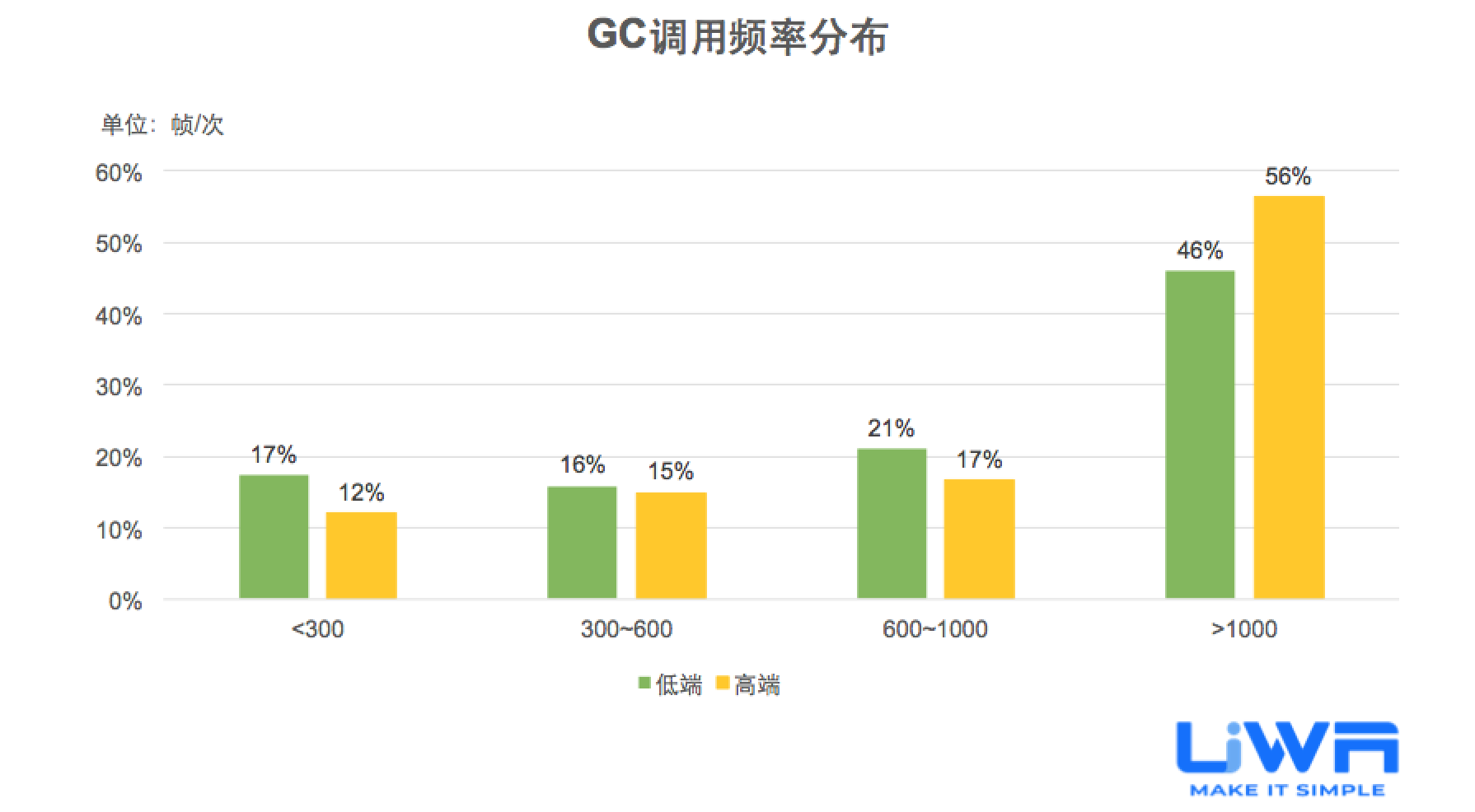 - GC触发频率很高,是造成卡顿的主要原因之一,目前只有51.2%的项目可以将GC的触发频率控制在1000帧/次以上。