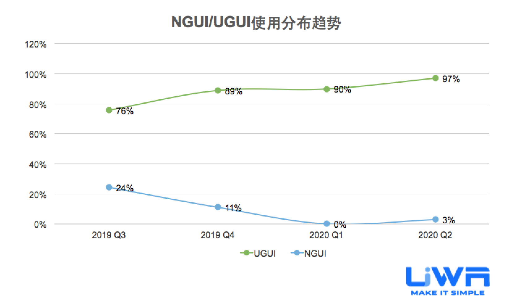 目前我们主要统计了NGUI和UGUI的占比以及详细的使用情况。在刚刚过去的四个季度中,UGUI的使用占比依然强势,最高时可达97%。NGUI的占比有明显下降的趋势。