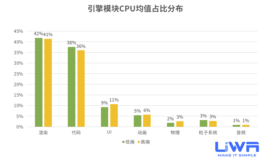 无论是高端还是低端的Android设备,渲染和逻辑代码都是需要研发团队重点关注的,它们的消耗总和占了总开销的近80%。