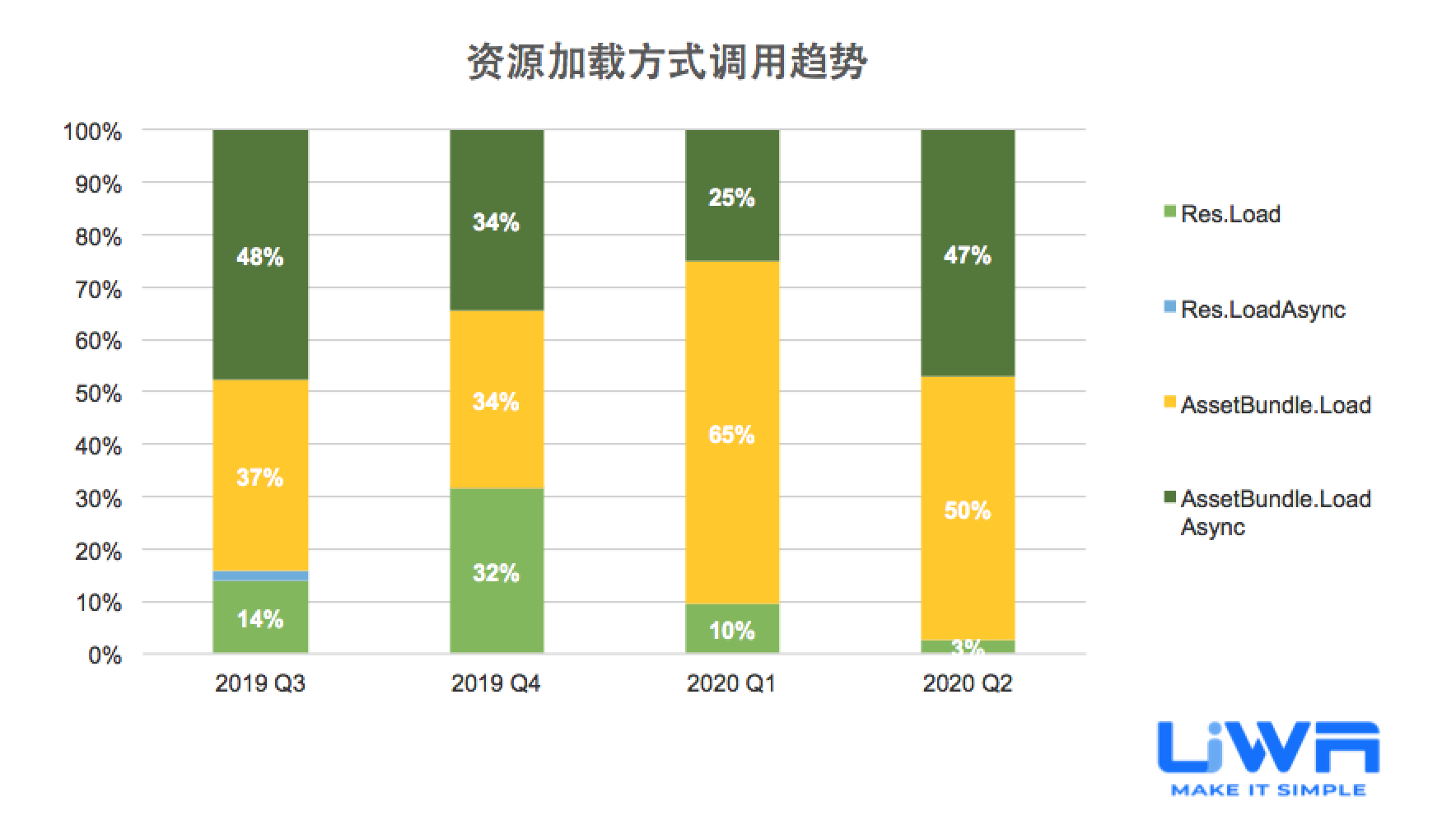 AssetBundle加载方式(Load和LoadAsync)的使用占比在过去的一年中都保持在80%左右。毫无疑问,AssetBundle加载方式是目前绝大多数研发团队的资源加载首选。