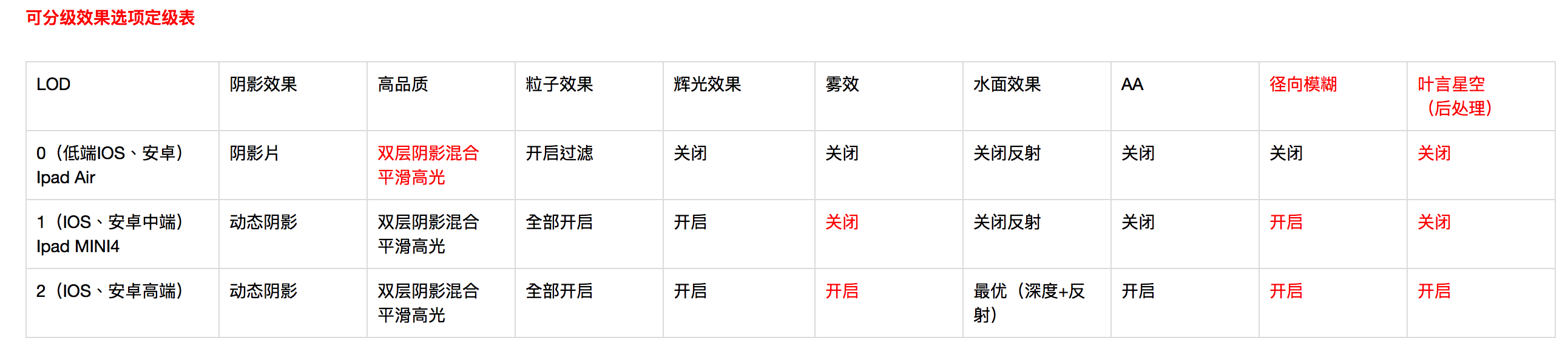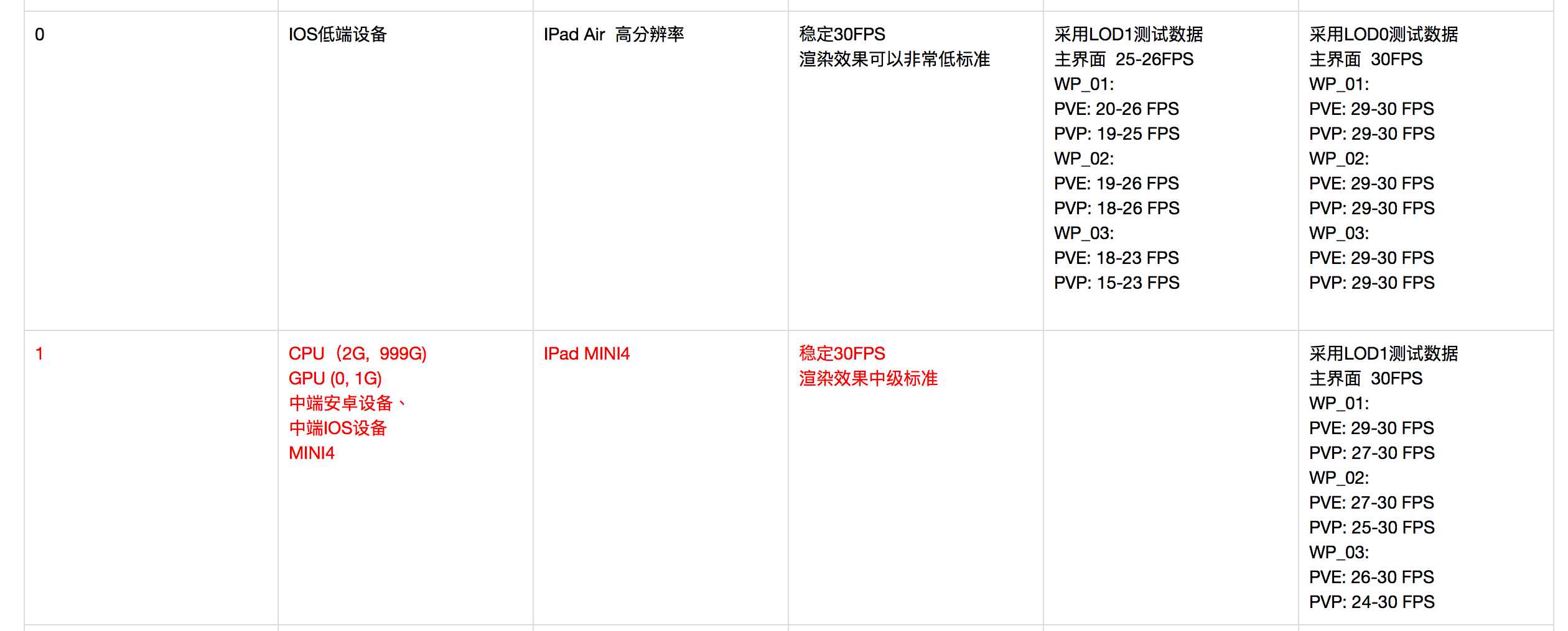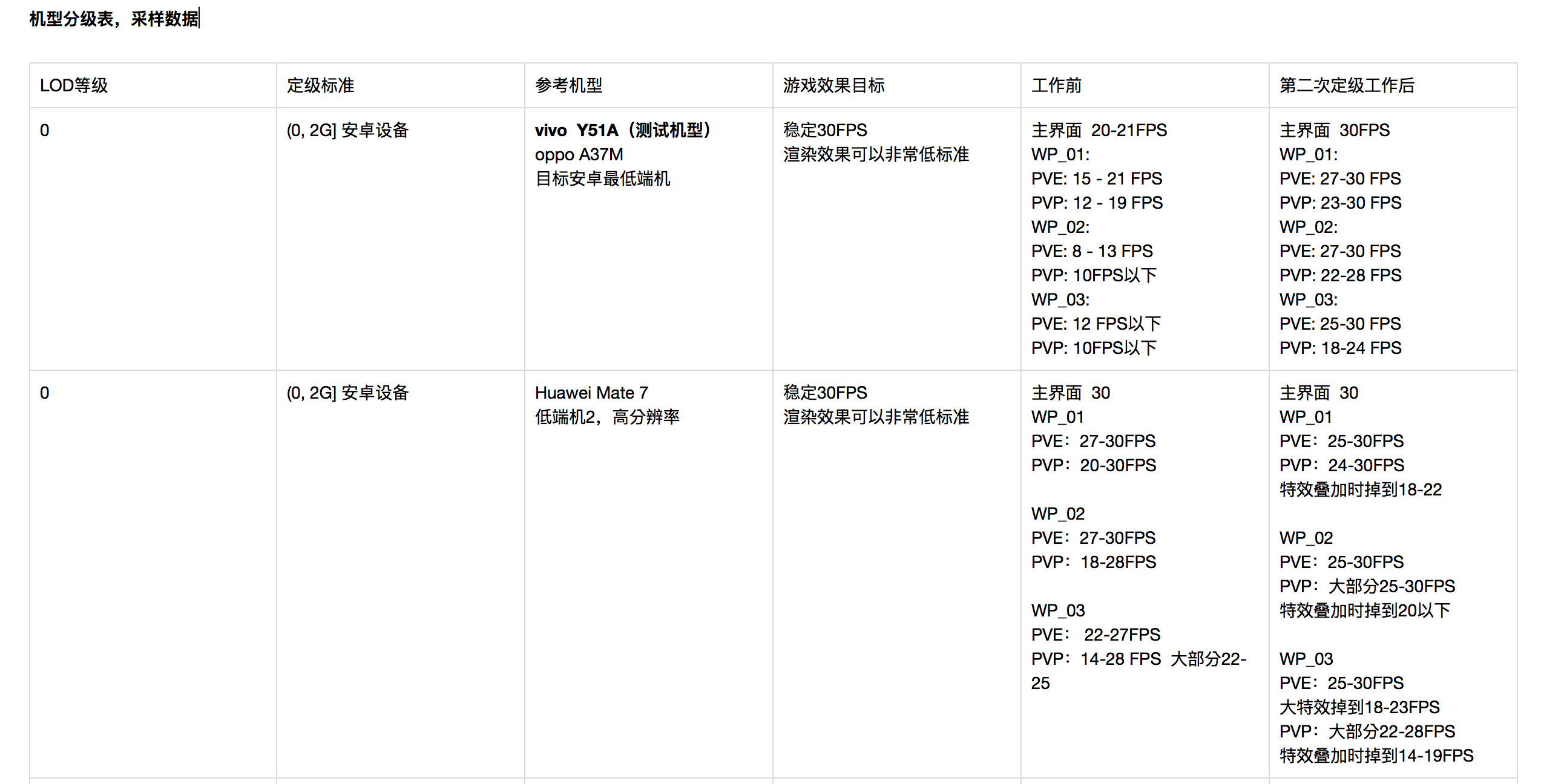 我们的项目还在开发中,也经历了同样的过程,最后也形成了类似的文档。这个过程中我的体会是,虽然感觉最后形成的是一个表,会根据这个表提供机型的预设配置。但是实际上针对自己的项目,高中低主力机型,FPS的目标,渲染效果的要求不同,结果可能会大不一样。