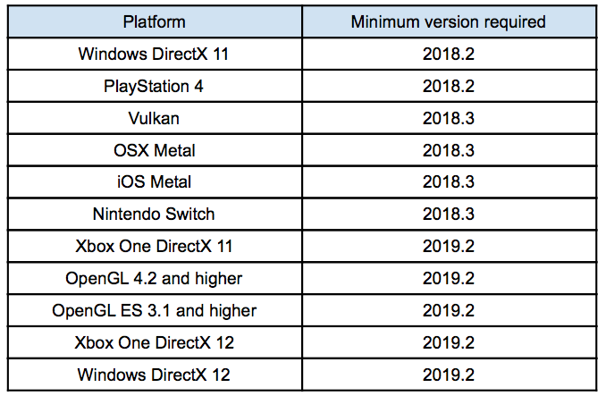 SRP Batcher 几乎适用于所有平台。下表显示了所需的平台和最低 Unity 版本。Unity 2019.2 目前处于开放 alpha 阶段。