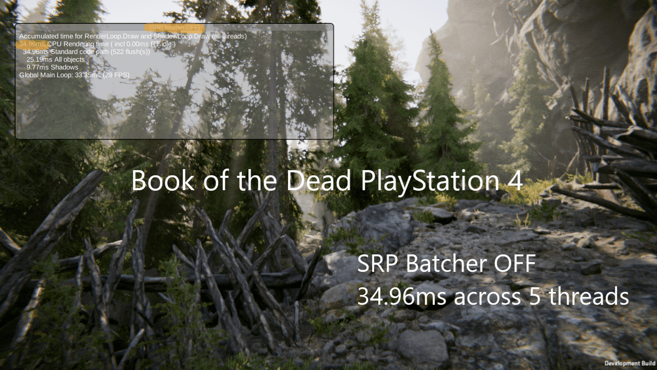 死亡之书、HDRP、PlayStation 4. x1.47 加速。请注意 FPS 不会改变,因为此场景受 GPU 限制。你还有 12 毫秒的时间在 CPU 端做其他事情。PC上的加速几乎相同。