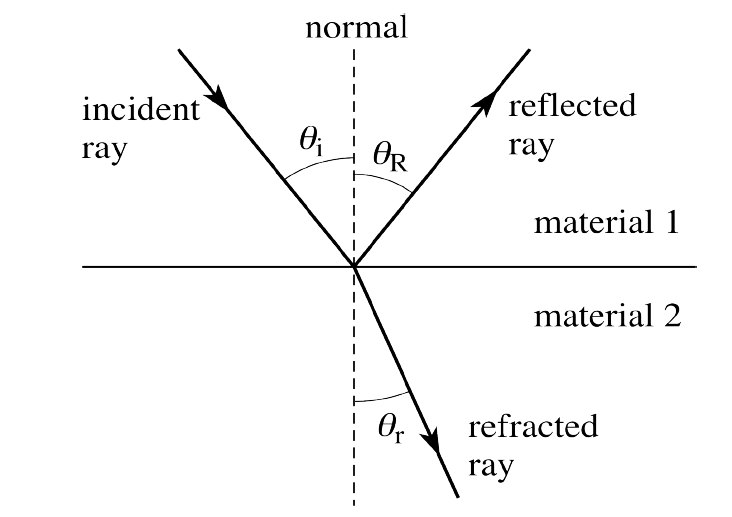 当一束光线入射到物体表面时,由于物体表面与空气两种介质之间折射率的快速变化,光线会发生反射和折射: