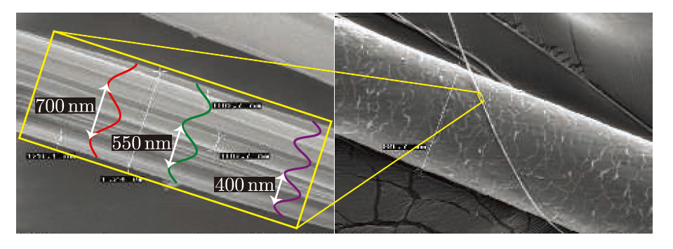 图 左侧可见光波长相对于单根蜘蛛丝线显示,单根蜘蛛丝宽度略大于1微米。