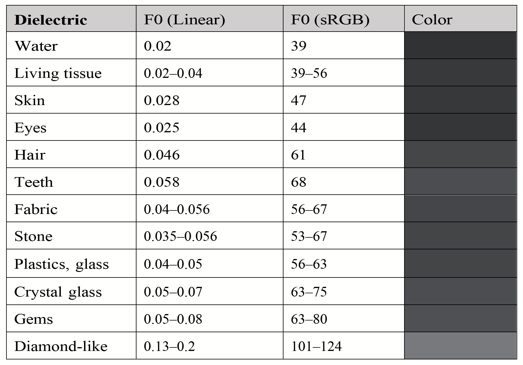 图 【PBR白皮书】常见材质F0参考速查图表