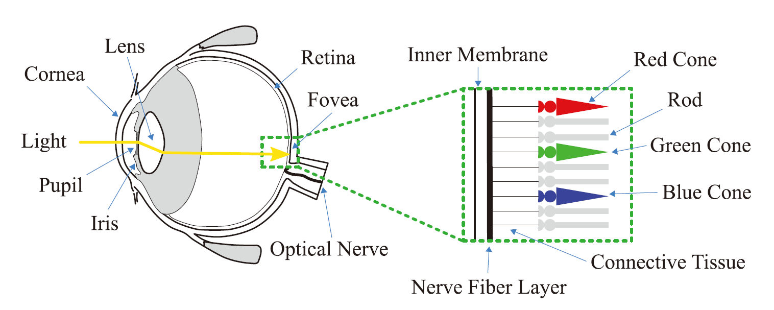 随后,光被晶状体(lens)折射并撞击视网膜(retina)中的两种类型的感光细胞(photoreceptors),视锥细胞(cones)和视杆细胞(rods)。这些感光细胞从视野范围内吸收光子,然后经一系列特殊复杂的生物化学通路,根据光线中的不同的波长产生不同颜色的视觉信号,波长越高的光偏红,波长越低的光偏蓝。视觉信号通过视神经(optical