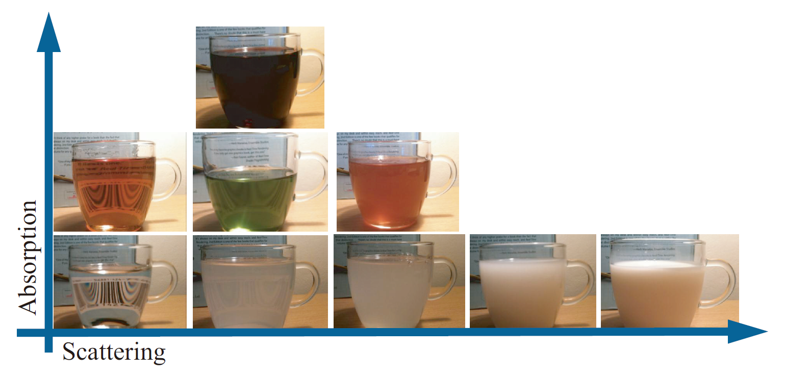 图 具有不同吸收和散射组合的液体容器 (图片来自Real-Time Rendering 4th)