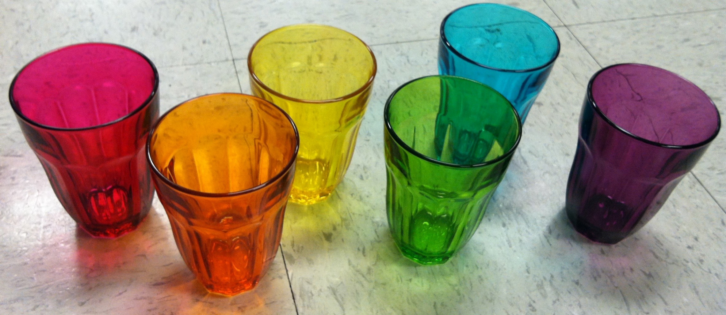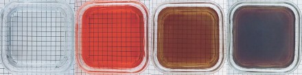 图 四个小容器的液体具有不同的吸收属性。 从左到右:清水,石榴糖浆,茶和咖啡。