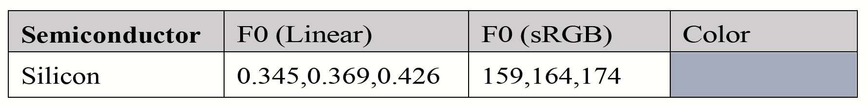 即是是最常见的半导体硅,在大多数场景渲染中也十分少见。出于实用性,PBR工作流一般不考虑半导体,即因避免在0.2和0.45之间的F0值。当然,故意尝试非真实感材质或外星场景中的材质时是例外。