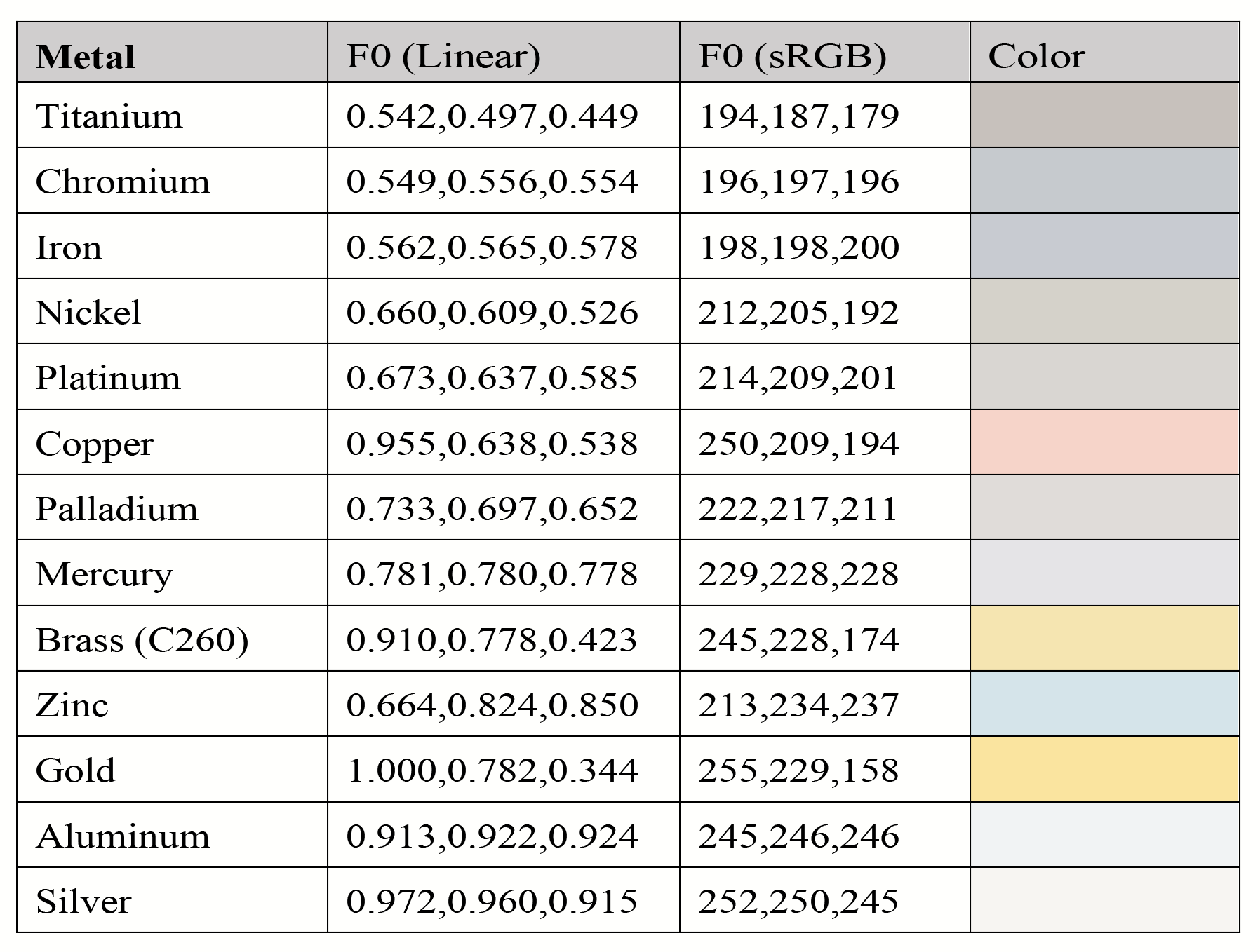 本文在创作期间,参考了《Real-Time Rendering 4th》等文献,总结和制作了如下的PBR材质F0反射率速查图表,其中分别对常见材质的线性值,sRGB值和参考颜色进行了列举,以方便PBR材质的创作: