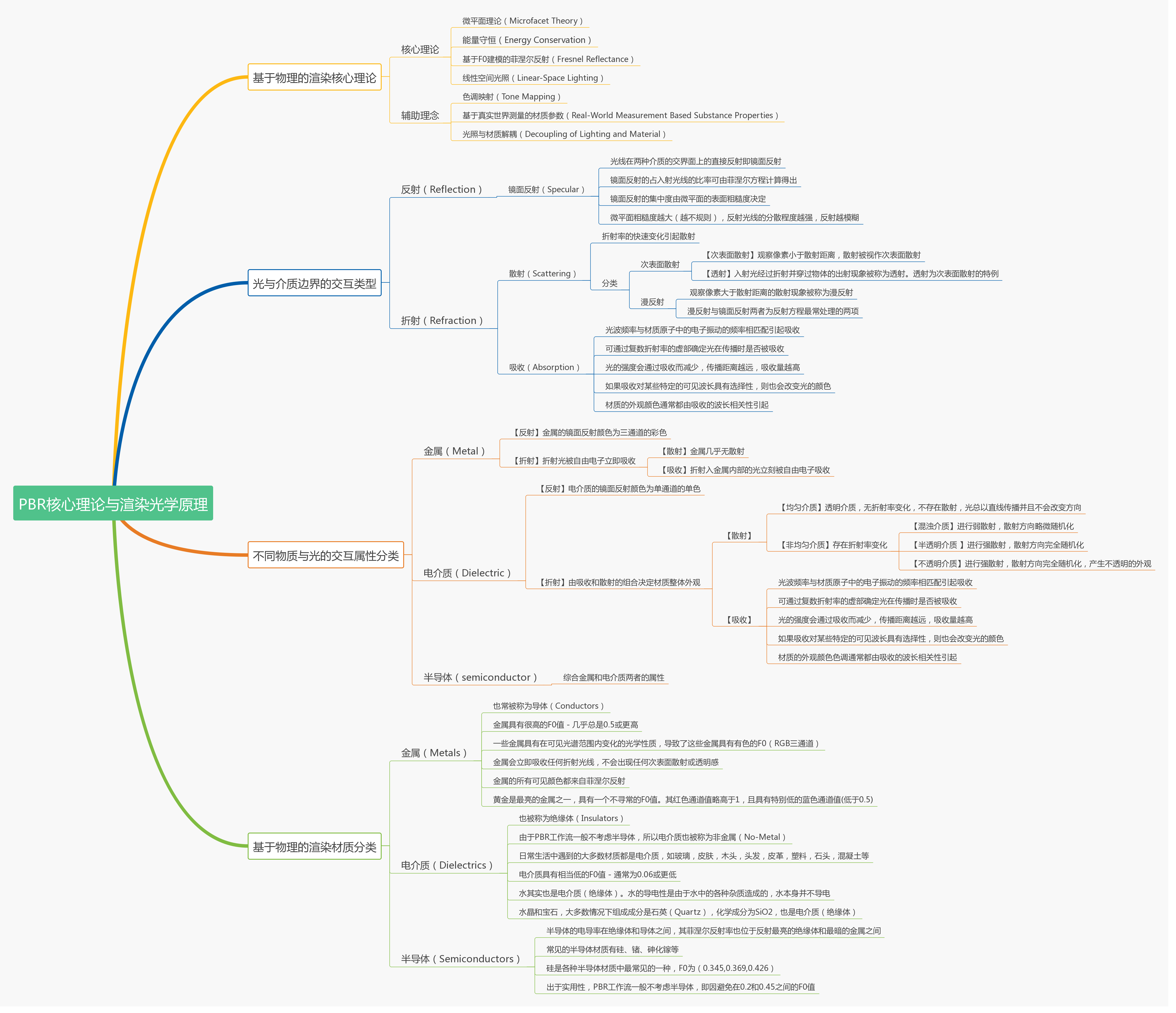 首先放出本文主要内容提炼出的思维导图,即基于物理的渲染的核心理论与渲染光学原理的知识脉络:
