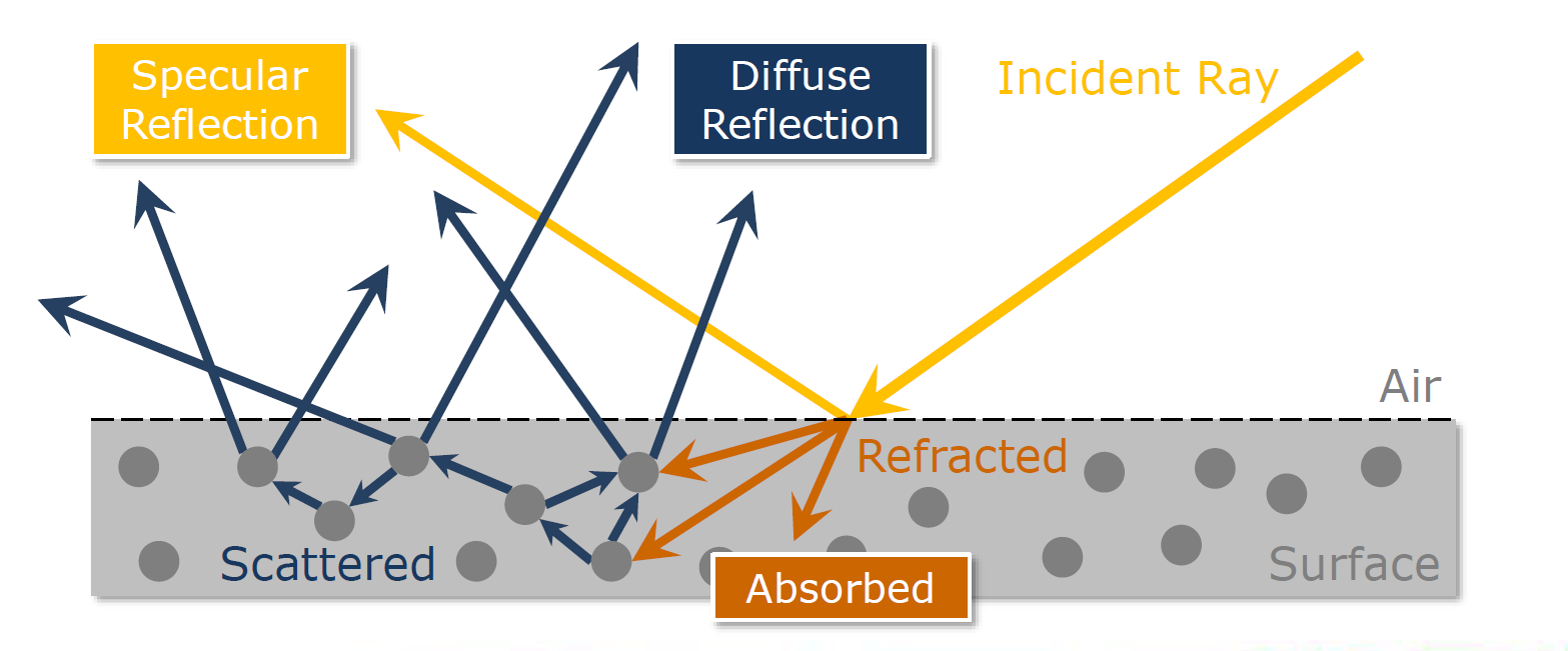 折射(Refraction)。 从表面折射入介质的光,会发生吸收(absorption)和散射(scattering),而介质的整体外观由其散射和吸收特性的组合决定,其中: