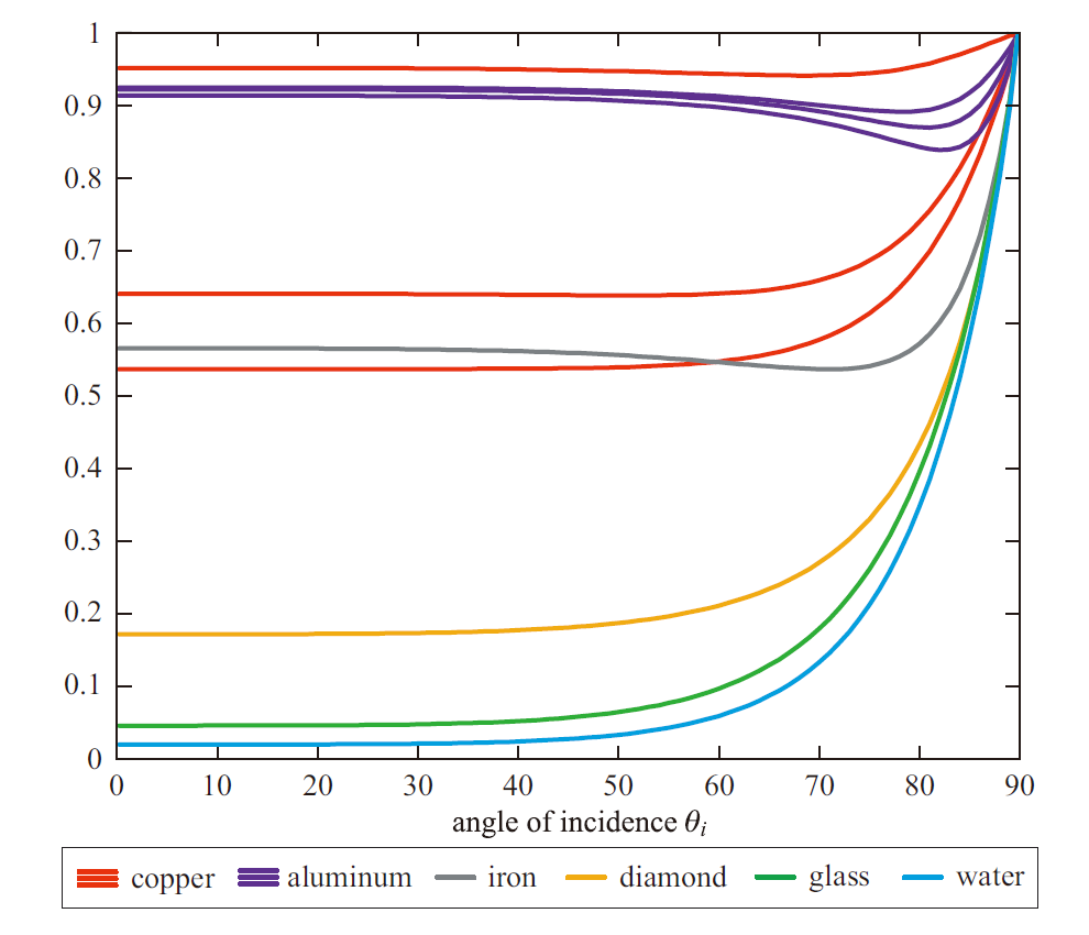图 各种物质的菲涅尔反射率(y轴)作为入射角(x轴)的函数。