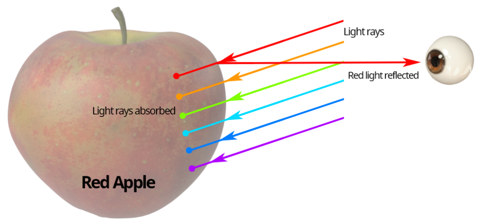首先需要注意的是,我们在现实生活中看到某一物体的颜色其实并不是这个物体本身的真实颜色,而是其反射和散射得到的颜色。换句话说,那些不能被物体吸收(Absorb)的颜色,即被反射或散射到我们人眼中的可见光波长代表的颜色,就是我们能够感知到的物体的颜色。
