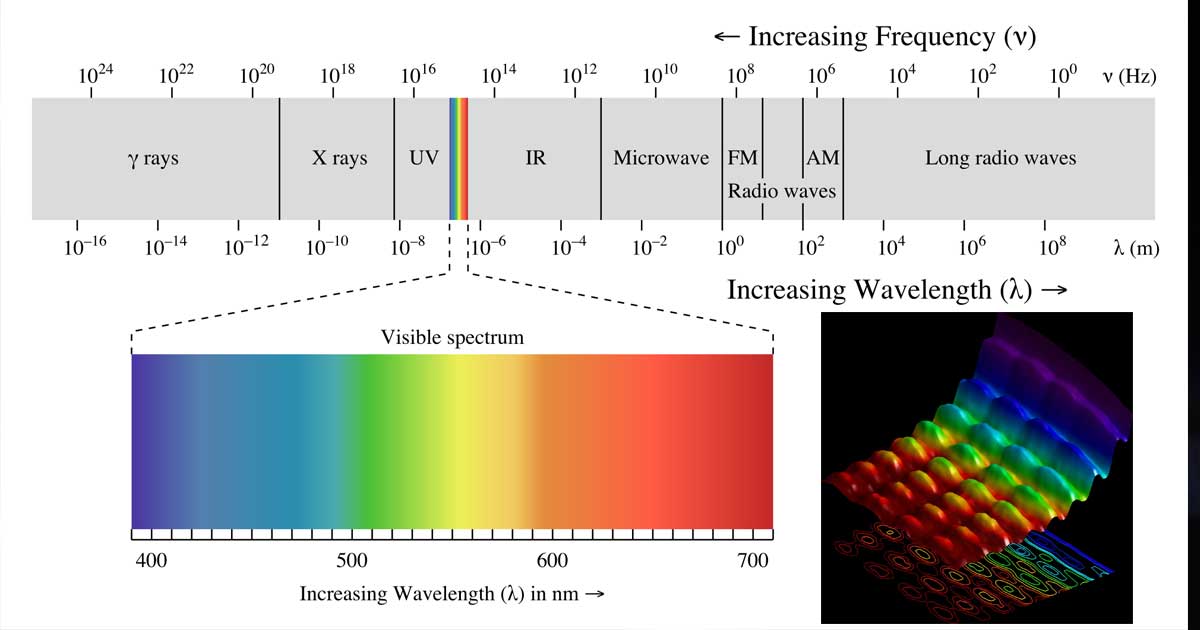 如果要给可见光波长一个度量上的感知,400nm到700nm大约是单根蜘蛛丝的一半到三分之一的宽度,而单个蜘蛛丝本身不到人类头发宽度的五十分之一