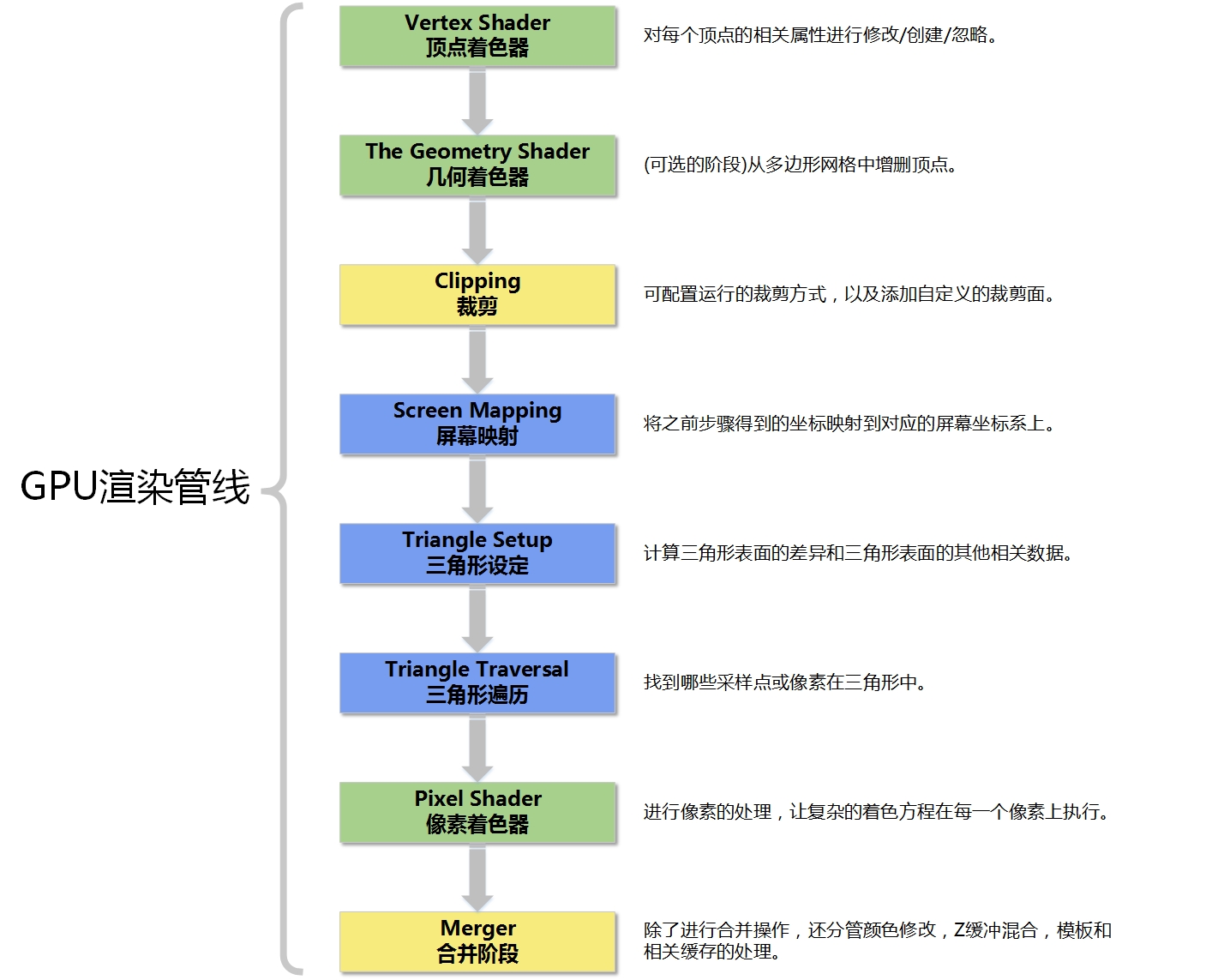 Shader,OpenGL中的叫法),是完全可编程的阶段,主要作用是进行像素的处理,让复杂的着色方程在每一个像素上执行。合并阶段(The Merger