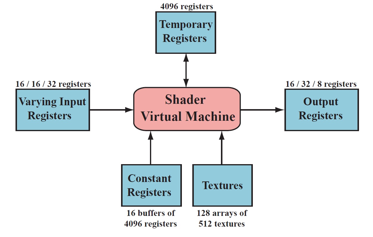着色语言虚拟机可以理解为一个处理多种类型寄存器和数据源、预编了一系列指令的处理器。考虑到很多图形操作都使用短矢量(最高四位),处理器拥有4路SIMD(single-instruction multiple-data,单指令多数据)兼容性。每个寄存器包含四个独立的值。32位单精度浮点的标量和矢量是其基本数据类型;也随后支持32位整型。浮点矢量通常包含数据如位置(xyzw),法线,矩阵行,颜色(rgba),或者纹理坐标(uvwq)。而整型通常用来表示,计数器,索引,或者位掩码。也支持综合数据类型比如结构体,数组,和矩阵。而为了便于使用向量,向量操作如调和(swizzling,也就是向量分量的重新排序或复制),和屏蔽(masking,只使用指定的矢量元素),也能够支持。虚拟机的输入和输出见图3.2。