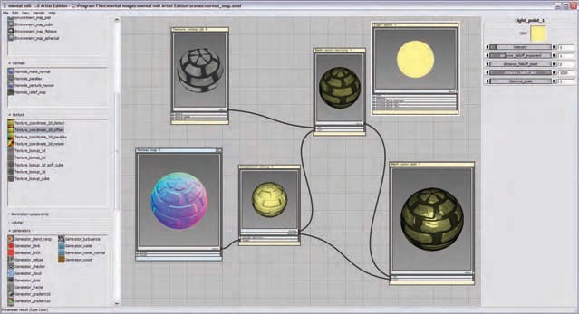 mill”的可视化着色器设计系统。各种操作都封装在功能窗中,位于左侧。每个功能窗都有可调参数,每个功能框的输入和输出彼此连接,形成最终结果。