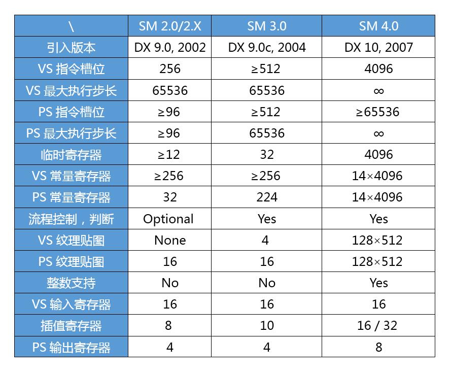 下表3.1比较了各种着色模型的能力。在这个表格中,VS”代表顶点着色器和“PS”代表像素着色器(而着色模型4.0