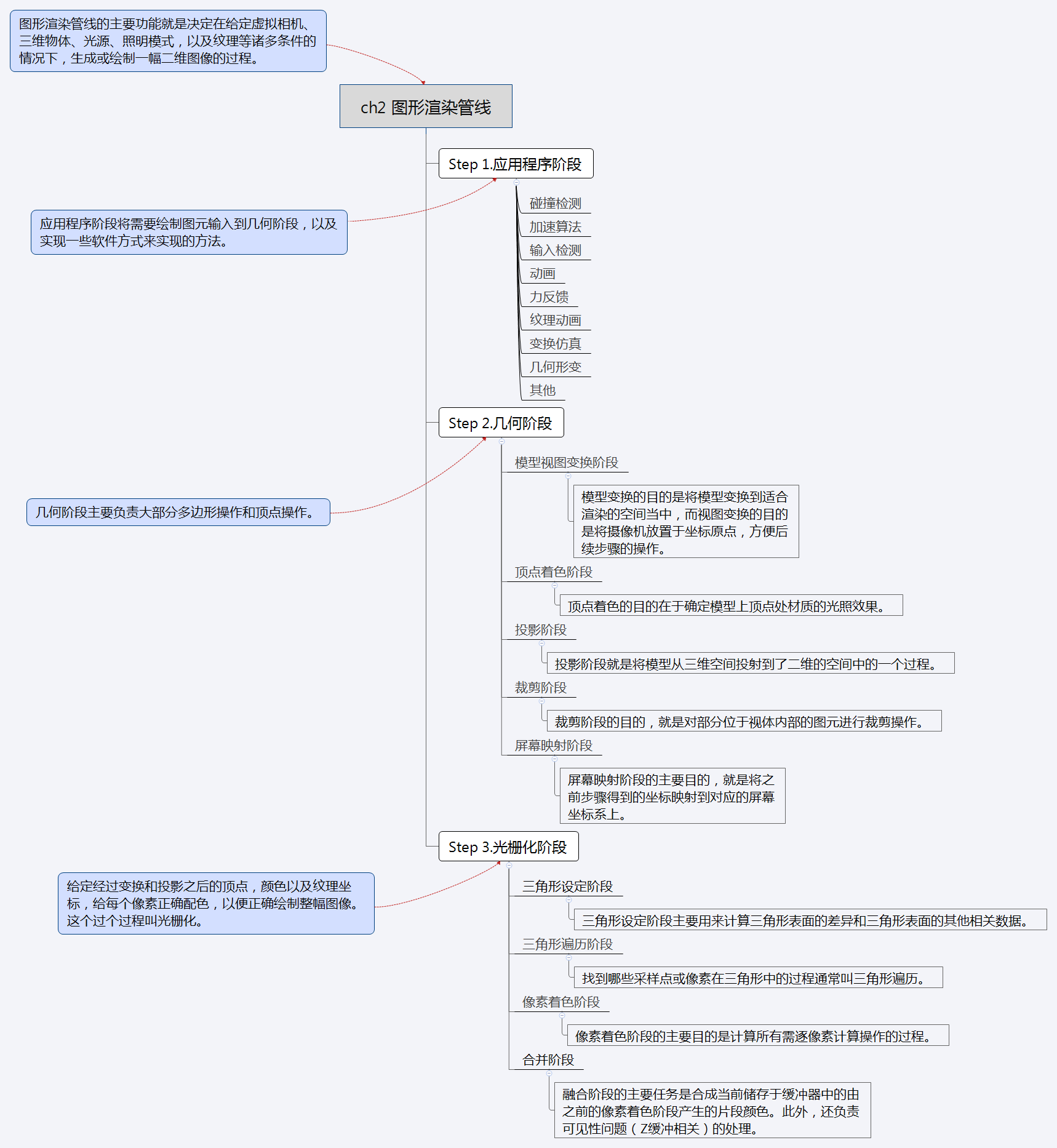 原书图2.2 绘制管线的基本结构包括3个阶段:应用程序、几何、光栅化。
