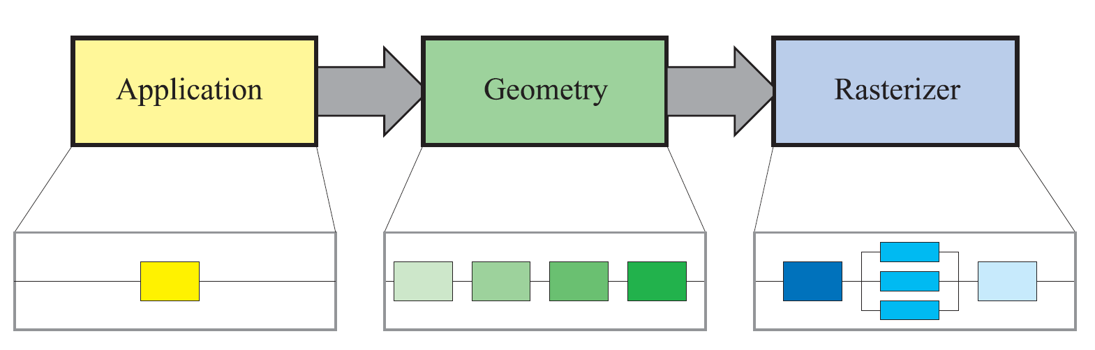 每个阶段本身也可能是一条管线,如图中的几何阶段所示。此外,还可以对有的阶段进行全部或者部分的并行化处理,如图中的光栅化阶段。应用程序阶段虽然是一个单独的过程,但是依然可以对之进行管线化或者并行化处理。