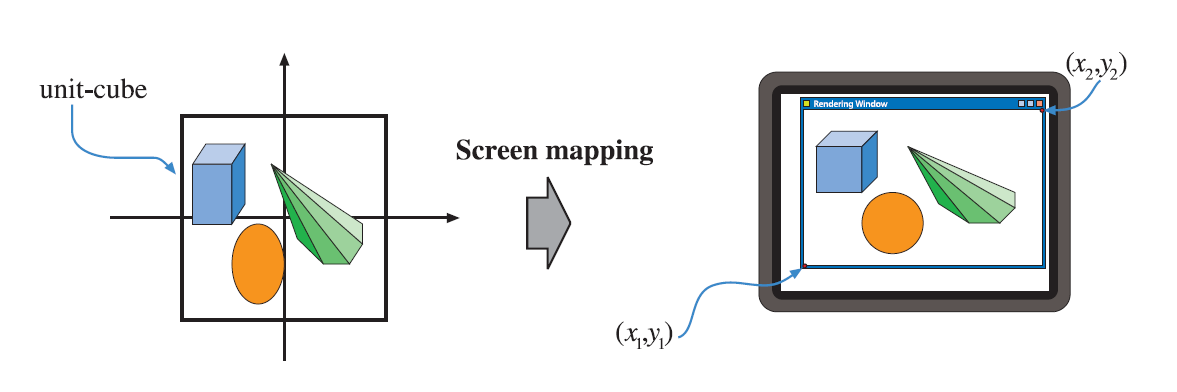 只有在视体内部经过裁剪的图元,以及之前完全位于视体内部的图元,才可以进入到屏幕映射阶段。进入到这个阶段时,坐标仍然是三维的(但显示状态在经过投影阶段后已经成了二维),每个图元的x和y坐标变换到了屏幕坐标系中,屏幕坐标系连同z坐标一起称为窗口坐标系。