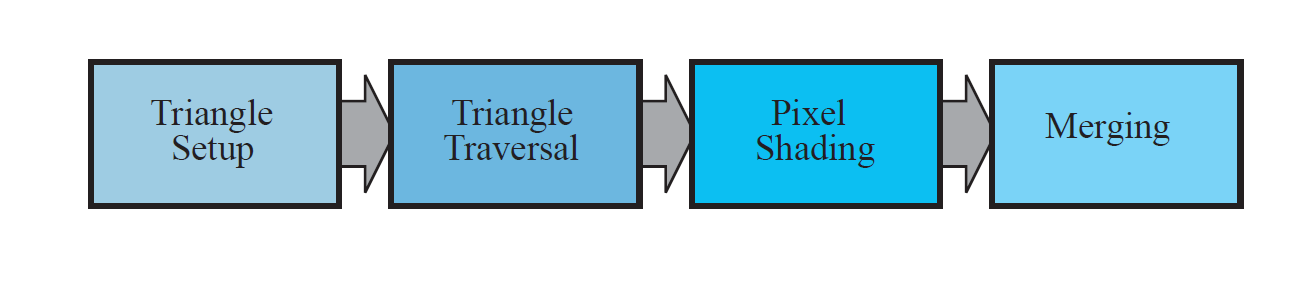 在光栅化阶段,所有图元会被光栅化,进而转换为屏幕上的像素。首先,计算三角形表面的差异和三角形表面的其他相关数据(三角形设定阶段),然后,找到哪些采样点或像素在三角形中(三角形遍历阶段),接着计算所有需逐像素计算操作(像素着色阶段),然后,合成当前储存于缓冲器中的由之前的像素着色阶段产生的片段颜色,可见性问题可通过Z缓存算法解决,随同的还有可选的alpha测试和模版测试(融合阶段)。所有对像依次处理,而最后的图像显示在屏幕上。