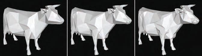 几何形变LOD的简化模型图示。左边和右边的图像所示分为为低细节层次和高细节层次的模型,中间的图像是在左右模型中间进行插值生成的几何变形模型。注意。中间的牛模型和右边的模型具有相同数量的顶点和三角形。