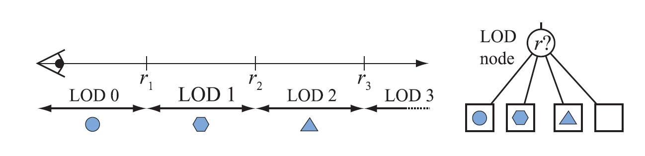 左图为基于距离的LOD的原理示例图。其中,LOD3是一个空物体,也就是表示当物体大于r3时,就不渲染任何物体,因为物体对图像的贡献度不够。右图为场景中的一个LOD节点,它只有一个子节点基于r。