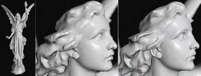 splats)。左图为名为Lucy的天使模型,拥有10万个顶点。但在渲染中只用到了300万个油彩,中图、和右图是对左边图的放大。在渲染中,中间的图像使用4万个油彩,当视点停止移动时,就变成了右图,使用了60万个油彩(此图由Szymon