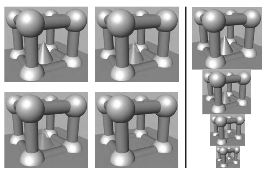 LOD对图中的圆锥体进行渲染,当距离圆锥体较远时,就提高它的透明度,直到最后消失。直线左边的图像是从同一距离处进行的观察,而直线右边的图像是左边图像不同尺寸的情形。