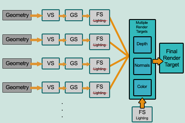 使用多个渲染目标,将每个几何图形(但不带阴影)渲染到多个屏幕空间缓冲区。特别是,深度,法线和颜色都写入了单独的缓冲区(图像)。然后将这些缓冲区组合起来,以为每个光提供足够的信息以照亮像素。