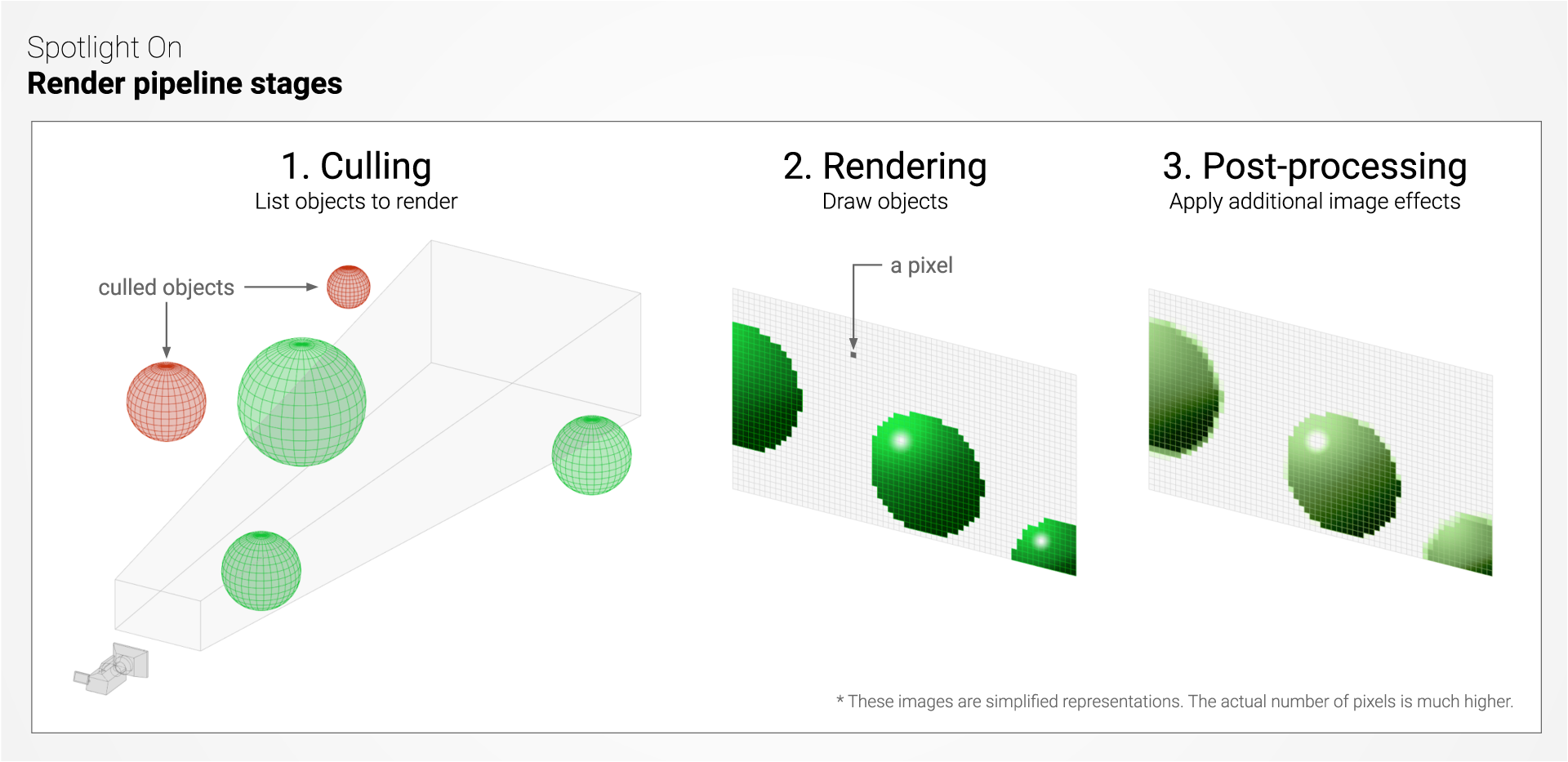 - 第一步是剔除;它列出了需要渲染的对象,最好是那些对摄像机可见的对象(视锥体剔除)和其他对象不遮挡的对象(遮挡剔除)。