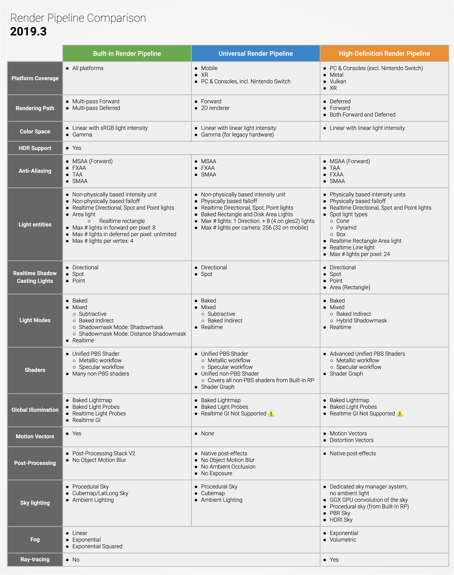 下表概述了 Unity 2019.3 中每个渲染管线支持的功能。