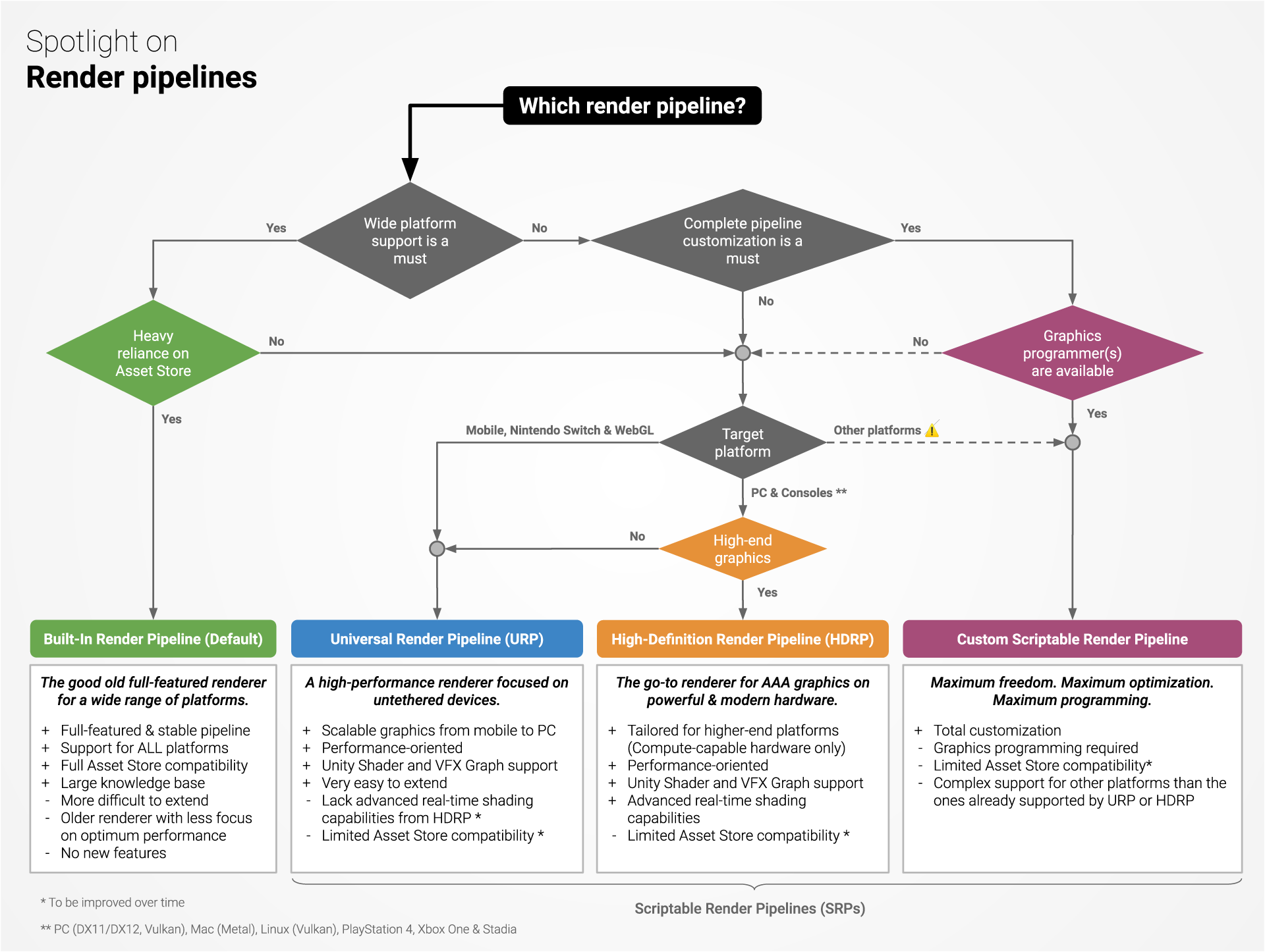 您可以使用下面的决策图表来快速确认您应该根据几个关键标准选择哪一种渲染管线。