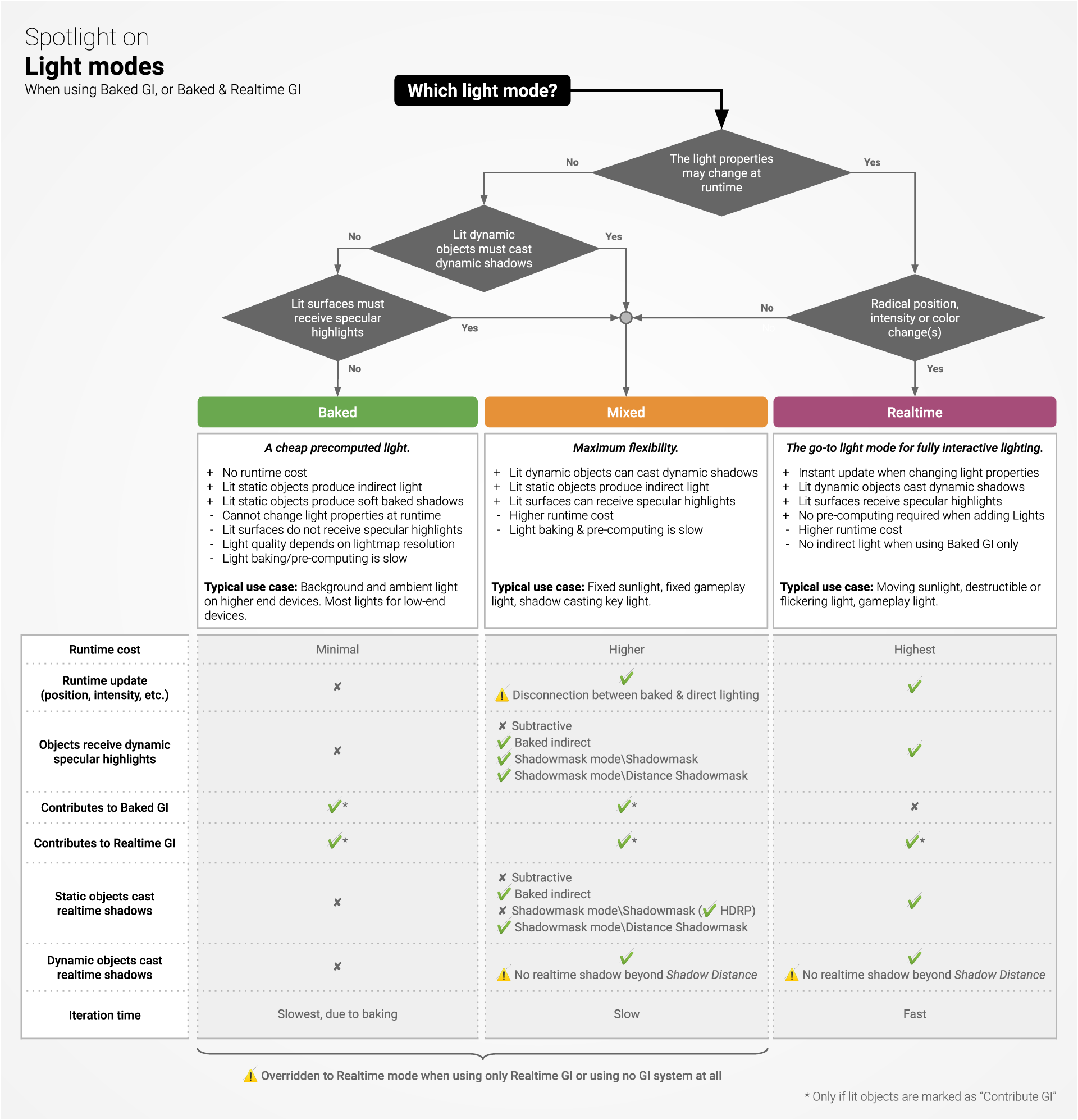 下面的图表结合了一个决策流程图和一个比较表;可以帮助您决定每次在场景中添加新光源时哪种光源模式合适。