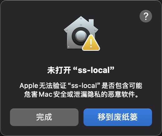 ShadowsocksX-NG 启动提示未打开 ss-local ShadowsocksX-NG 启动提示:未打开 “ss-local”Apple 无法验证 “ss-local” 是否包含可能危害 Mac 安全或泄漏隐私的恶意软件。 如图所示: 解决方法: 1xattr -rc /Applications/ShadowsocksX-NG.app/Contents/Resources/ss-local Mac Mac Shadowsocks Python 命名规范 上一篇 RectTransform 详解 下一篇